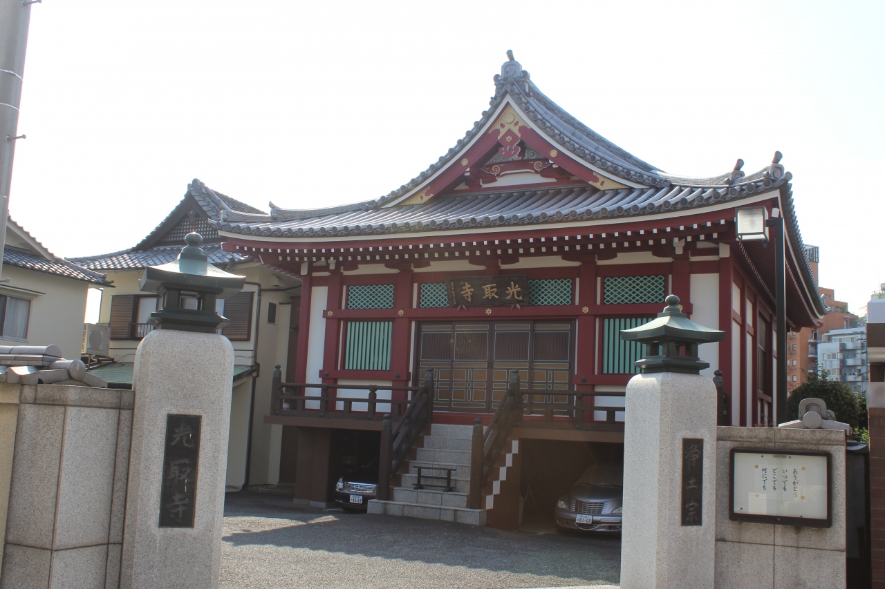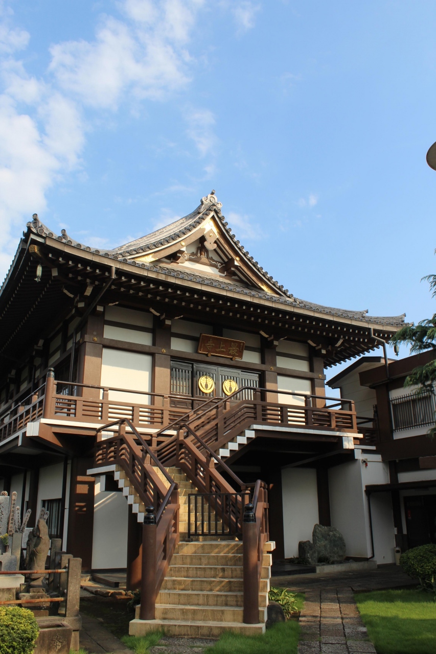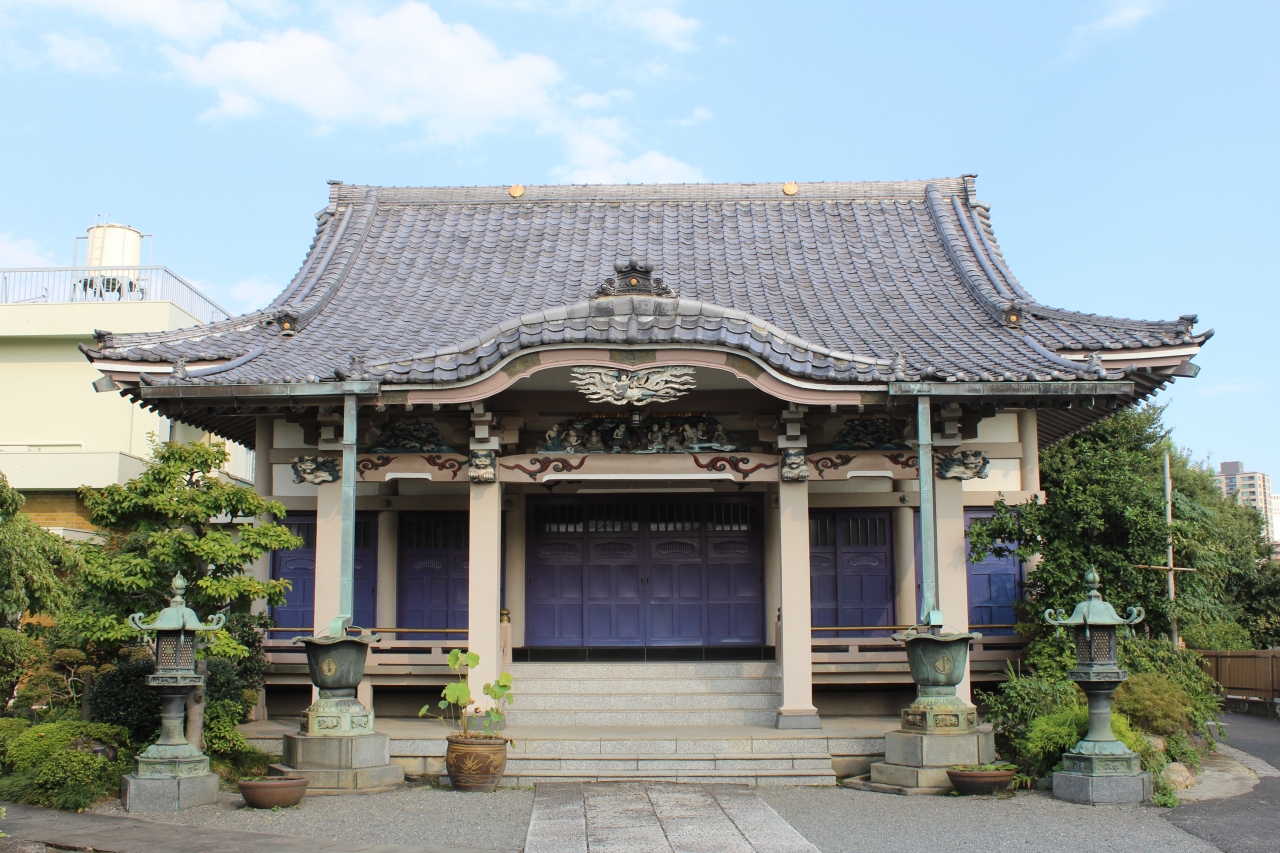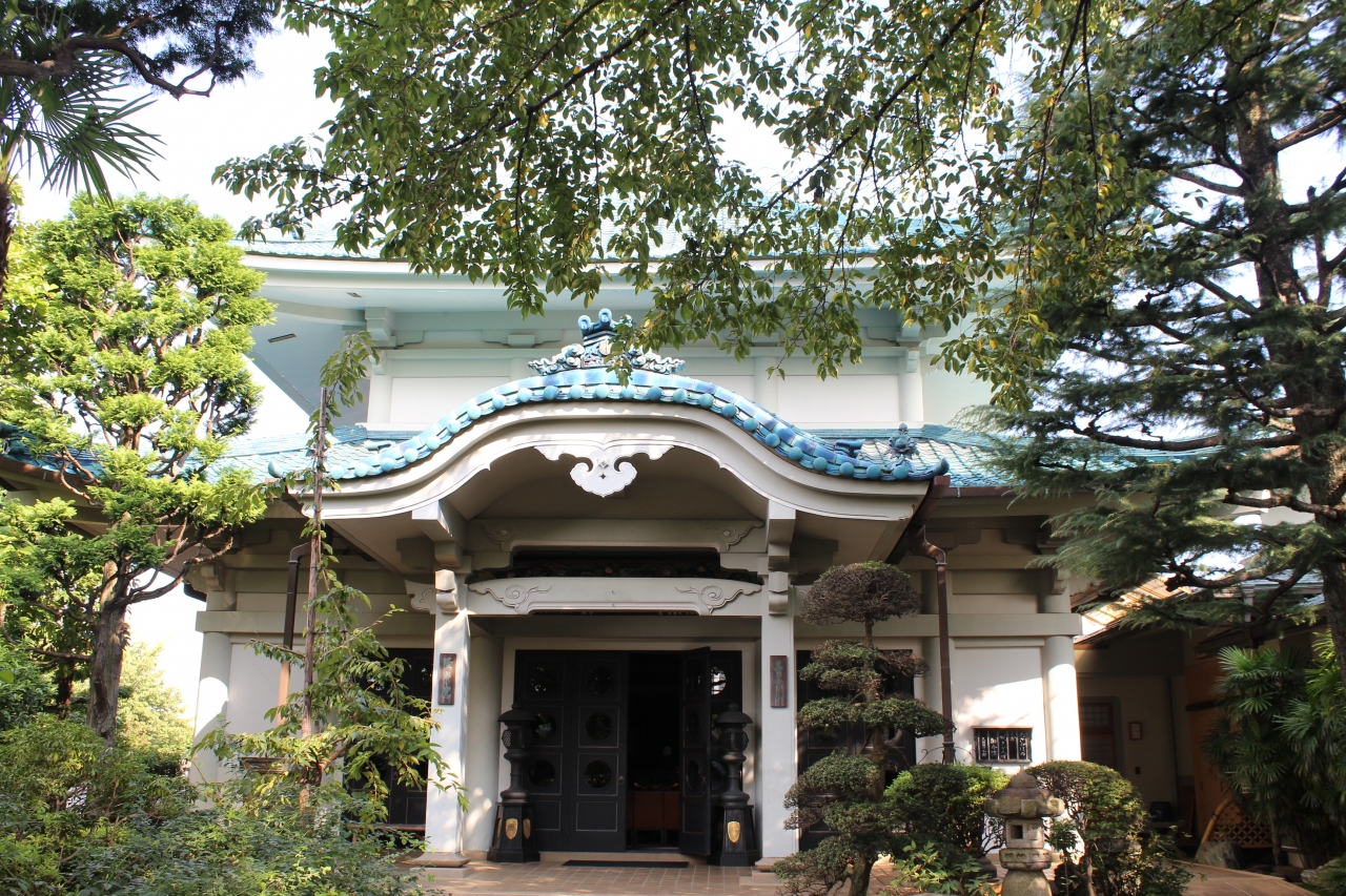 芝増上寺子院群のひとつ。本堂の天井に伊東深水による「牡丹唐獅子図」がある。