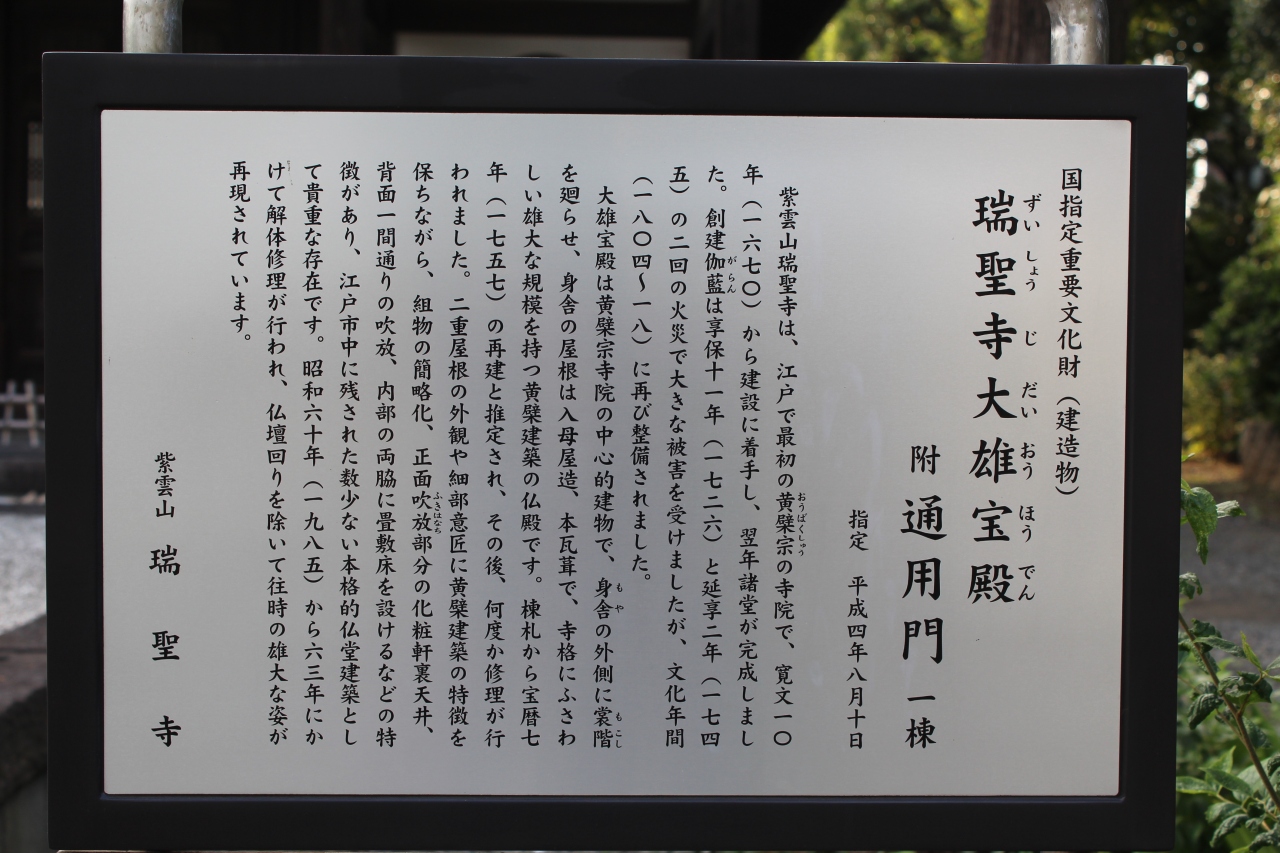 南北線白金台駅から徒歩2分のところにあります。瑞聖寺は、江戸で最初の黄檗宗(開祖は隠元上人:中国から日本にインゲンマメを持ち込んだ。総本山は京都宇治の万福寺)の寺院です。大雄宝殿は黄檗宗寺院の中心的な建物で、雄大な規模を持つ仏殿です。