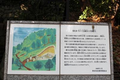 等々力渓谷の左岸崖面に横穴墓が6基以上発見され、中でも3号横穴は埋葬人骨や副埋葬品も良好であったことから保存措置が講じられた。3号横穴墓は奥行13mで玄室と羨道からなる墓室とこれに至る墓道に分かれている。横穴墓に近付くと自動で照明がつきます。
