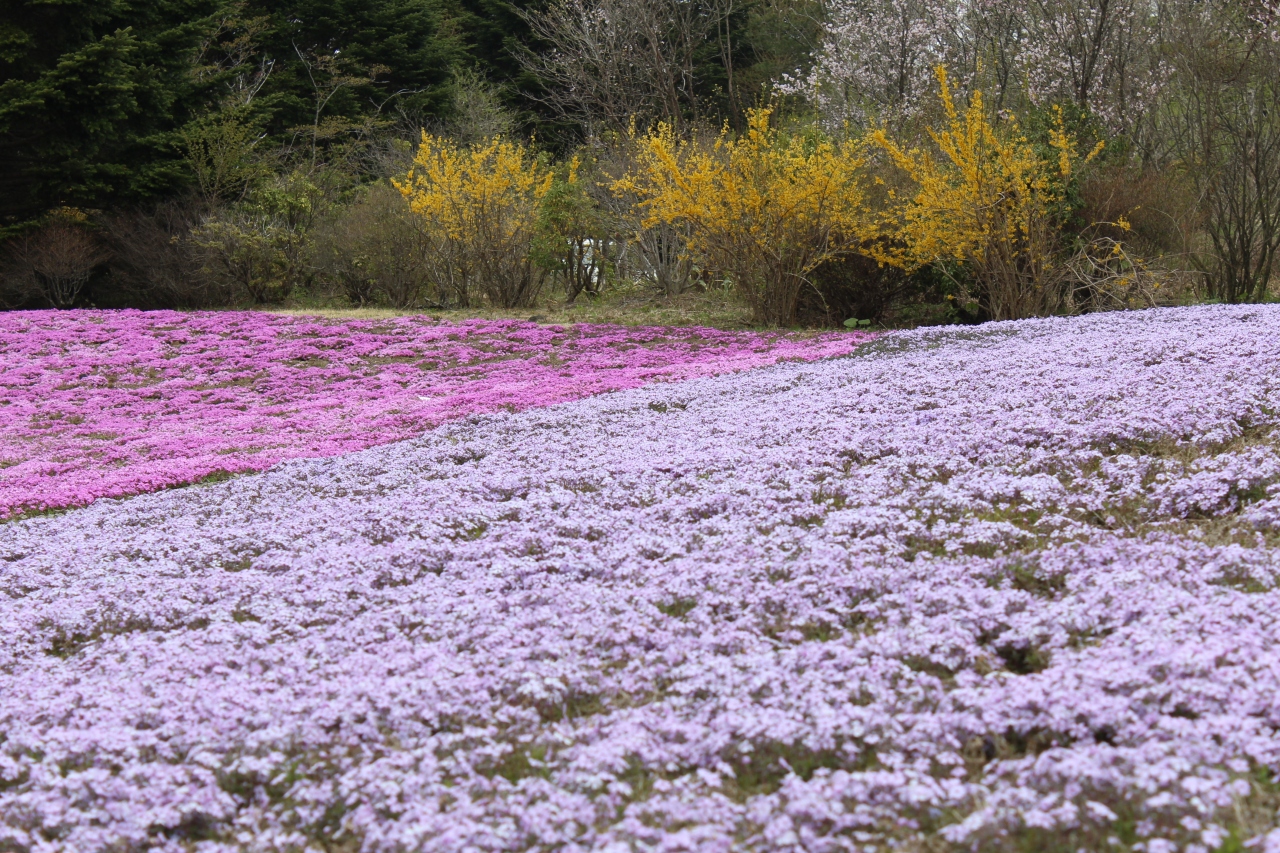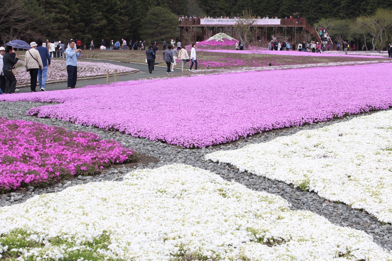 富士山と芝桜の絶景写真を見て行くことにしました。五月上旬で芝桜は四分咲きでしたので翌週が満開だったようです。天気は晴れでしたが、富士山は雲に隠れていてなかなか富士山と芝桜の景色を見ることが出来ませんでした。一瞬富士山の頂だけ雲が流れ、富士山と芝桜のコラボレーションを見ることができました。なかなか満開で快晴の時に訪れるのは難しいですね。富士山が見えない時のためか(世界遺産登録を記念して造ったそうです)、今年からミニ芝桜富士が造られています。会場では「富士宮やきそば」「甲州とりもつ煮」などを食することも出来ます。