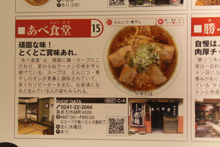 ランチに喜多方ラーメンを食べようと喜多方に車を走らせました。どの店がよいのか分からなかったので喜多方駅構内にある観光案内所に寄ってみました。そこで「喜多方老麺会」という立派なガイドブックを頂人気のある店を数店紹介してもらいました。その中からあべ食堂を選択しました。この店は「朝ラー」と言って朝から営業しているので午後3時には閉店します。午後2時過ぎに行ったので空いていました。
