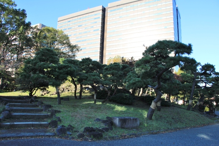 日比谷公園の北西部にちょっとした築山があります。公園造成時に出た残土で作られたものですが、今では綺麗に剪定された常緑の松が生き生きとしていて心地よい空間となっています。日比谷公園内は紅葉・黄葉が綺麗でしたが、松の緑もそれにも負けない程綺麗で良かったです。