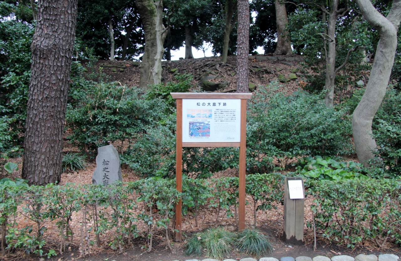 松の廊下は、江戸城内にあった大廊下のひとつです。浅野内匠頭が吉良上野介を切りつけた場所で、忠臣蔵で有名になったところです。今は松の廊下があった場所に碑が立っているだけで何も残っていません。特に見るべきものはない感じです。