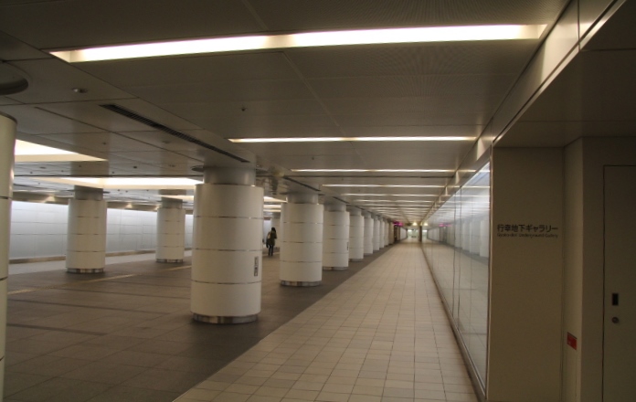 新丸ビルと丸ビルを地下で繋ぐ通路の先にエスカレーターでちょっと上がったところに行幸地下ギャラリーがあります。行幸通りの地下にあたり幅の広い通路で両側に展示スペースがありますが、何も展示されておらず閑散としていました。ちょっともったいない利用方法と思われます。