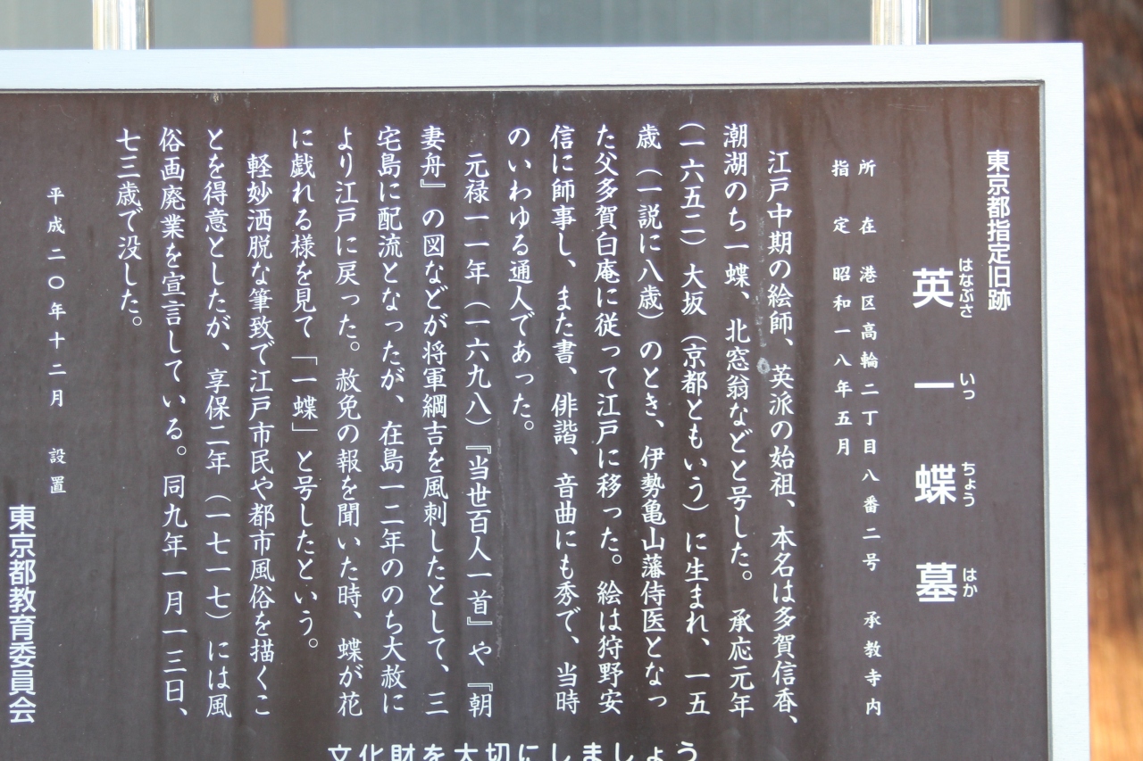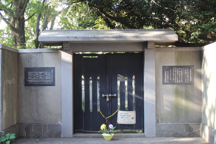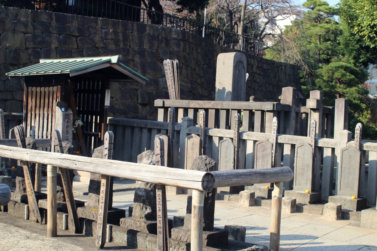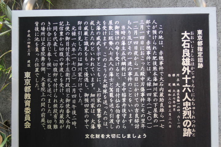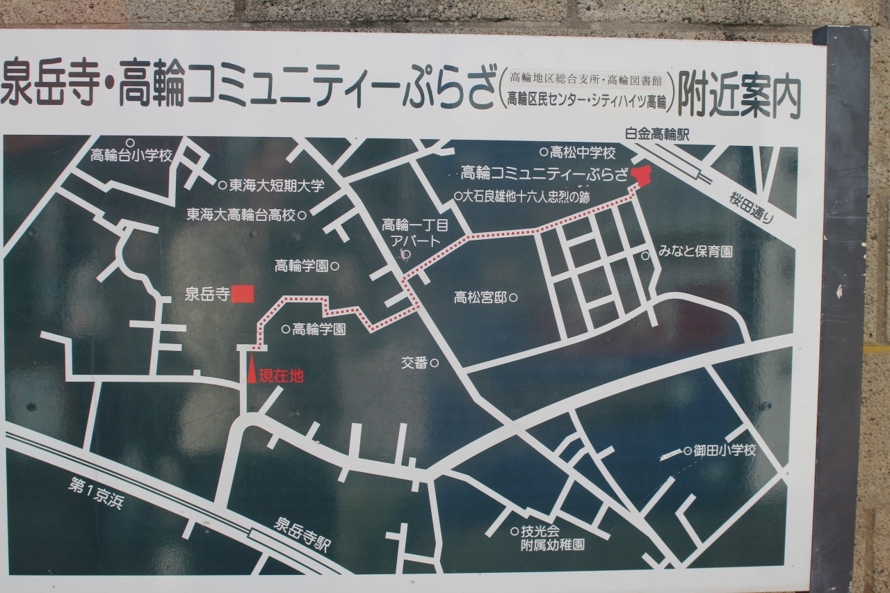 高輪台の都営団地の奥まったところにあります。泉岳寺から高輪学園脇の狭い路地を歩いてきましたが、泉岳寺の山門前あたりに地図がありますので、それを見れば迷わず行けると思います。もとは肥後熊本藩細川家の下屋敷があったところです。