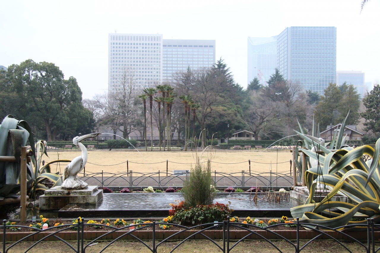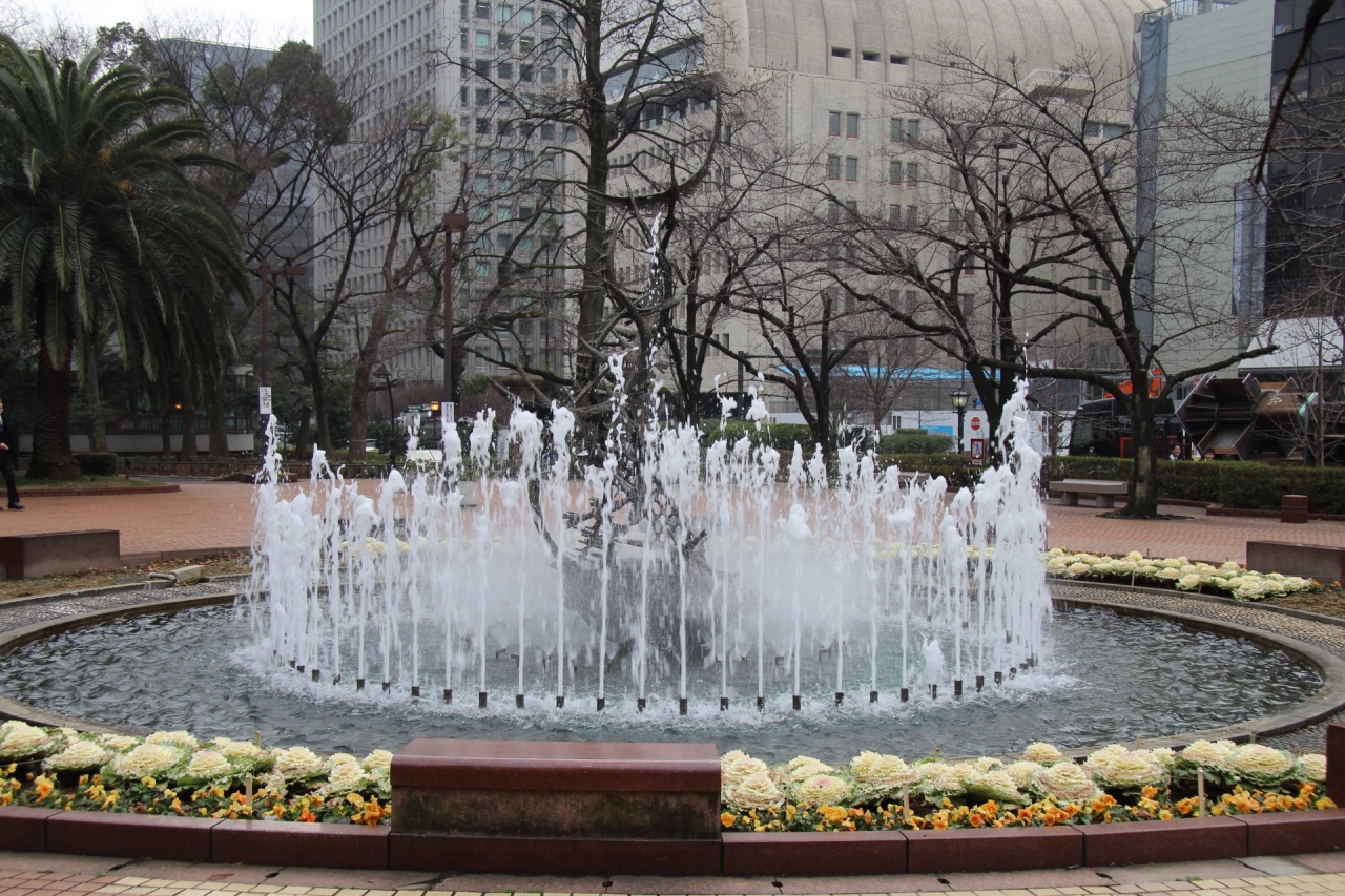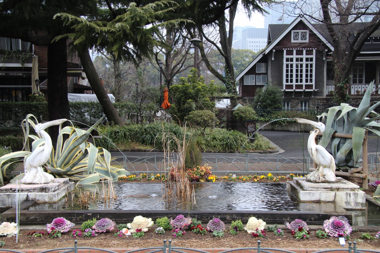 日比谷公園内には大噴水をはじめいくつかの噴水がありますが、ペリカン噴水はそのなかのひとつです。公園の北側にあります。向かい合わせの二羽のペリカンの嘴から水平方向に水が出ています。日比谷公園内にカモメ、鶴など鳥に関する噴水が多いですね。