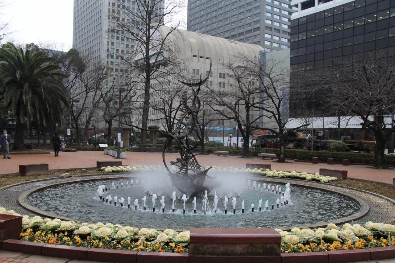 地下鉄霞が関駅に近い日比谷公園の南西の角にあります。周りに桜の木が多いので満開の時期には弁当を広げるOLが結構います。ただ喫煙コーナーが近くにあるのでタバコ臭いのが難点です。特に朝は出勤前のサラリーマンが大勢タバコを吸っているので近寄り難いものがあります。