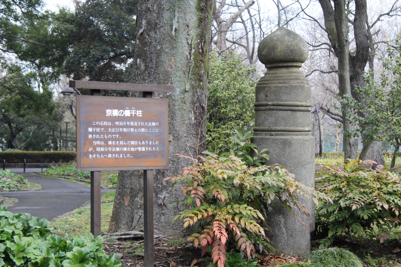 日比谷公園の雲形池の近くにあります。説明版がなければ、見落としてしまいそうな地味な存在です。明治時代に京橋川(今は埋め立てられている)の中央通りに架けられていた石造りの「京橋」の欄干柱が建て替えの際ここに移されました。