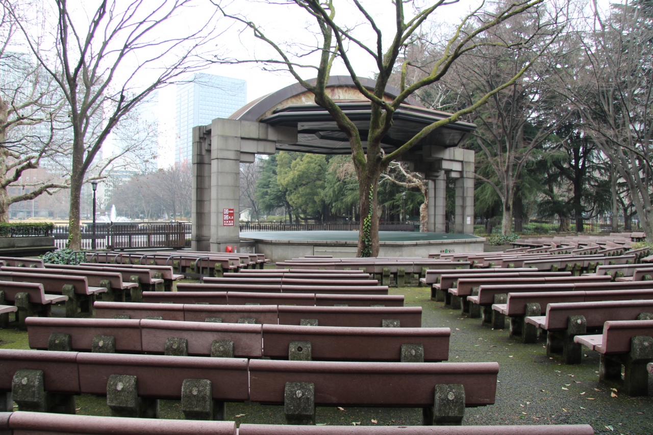 日比谷公園内には大小2つの音楽堂があります。小さな音楽堂は第一花壇と大噴水の間にあります。イベントがないと周りはひっそりとしています。4月からイベントが再開されるようです。外から見たところ座席はだいぶ老朽化している感じです。