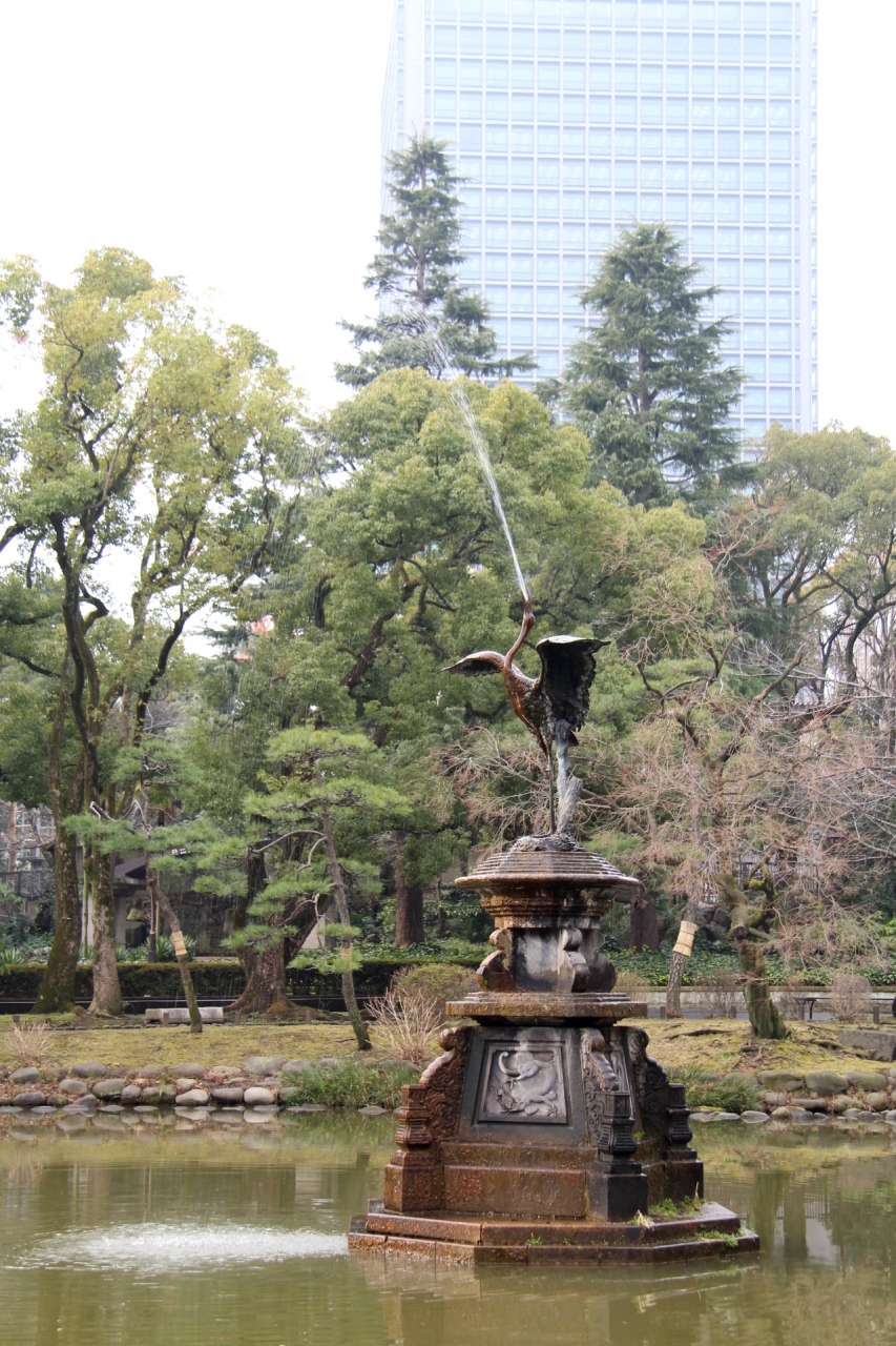 日比谷公園内に大噴水をはじめいくつもの噴水がありますが、鶴の噴水もそのうちのひとつです。日比谷公園の野外音楽堂と草地広場の間あたりにある雲型池の中にあります。上を向いた鶴の嘴から勢いよく水が飛び出しています。