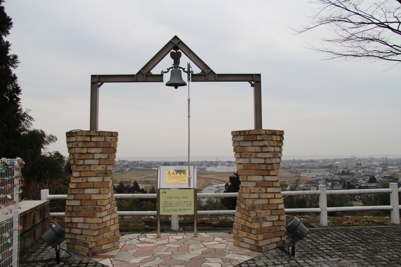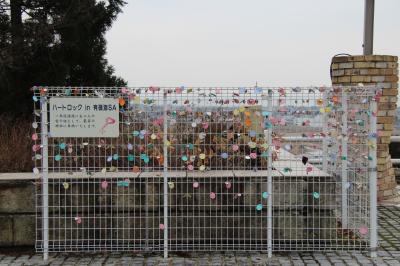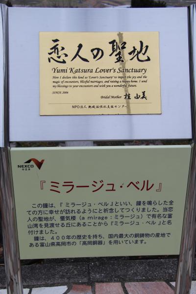 五箇山から上田駅に向かう途中トイレ休憩で立ち寄りました。富山湾を一望できる高台にありなかなか良い景色です。またこのSAも恋人の聖地と認定されていて、「ミラージュベル」や「ハートロック」もあります。「ミラージュベル」の前には記念写真を撮れるようにハート型をした台座のスタンドもあります。