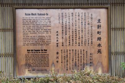 加賀藩二代藩主前田利長が金沢城防備の目的でキリシタン大名であった高山右近に命じて堀らせた金沢城の内堀である西内惣溝掘を生かして、池泉回遊式庭園の主計町緑水苑が造られています。主計町茶屋街のとなりですので合わせて見学するといいと思われます。
