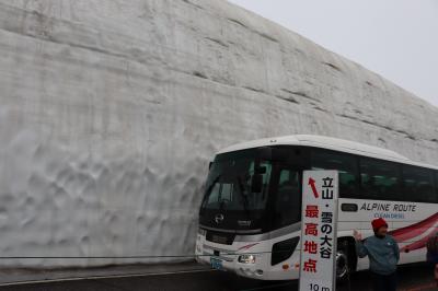 立山黒部アルペンルートを訪れるのは4回目ですが、今回初めて雪の大谷を見に行きました。室堂から大観峰までは結構雨が降っていて、立山連峰の山並みが見られなかったのが残念でした。雪の大谷は、雪がちょっと汚れていて残念な感じでした。青空の下で観ればイメージはかなり違っていたと思われます。
