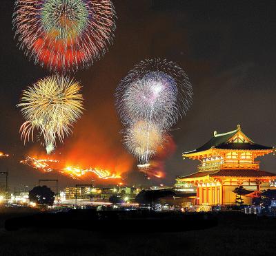 朱雀門や大極殿と若草山の山焼きを楽しんで、大極殿前で巡行する山車を見ることもできます。プログラムも両方楽しめるようになっています。