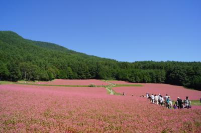 駐車場から、林を抜けると突然視界が開けます。東京ドームが入るくらいの敷地に、赤い蕎麦の花が、絨毯のように咲いています。周りの木々にも囲まれているので、とてもきれいです。なだらかな傾斜がついていますので、とてもよく見渡せます。