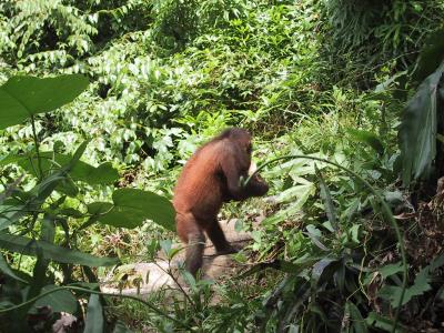 オラウータンの餌付け。かわいい、ふわふわの毛に包まれたあいくるしいオラ...