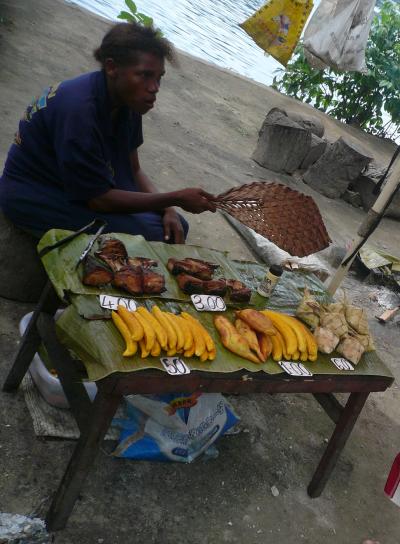 魚やバナナ、パンの実、いも等を、その場で油で揚げて売っています。バナナは50トヤからあり、高くても4キナ位なのでとても安いです。
