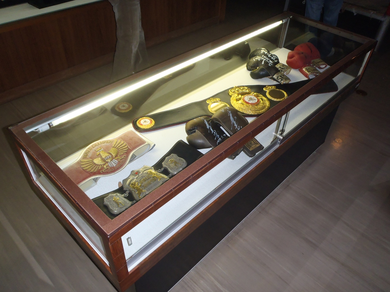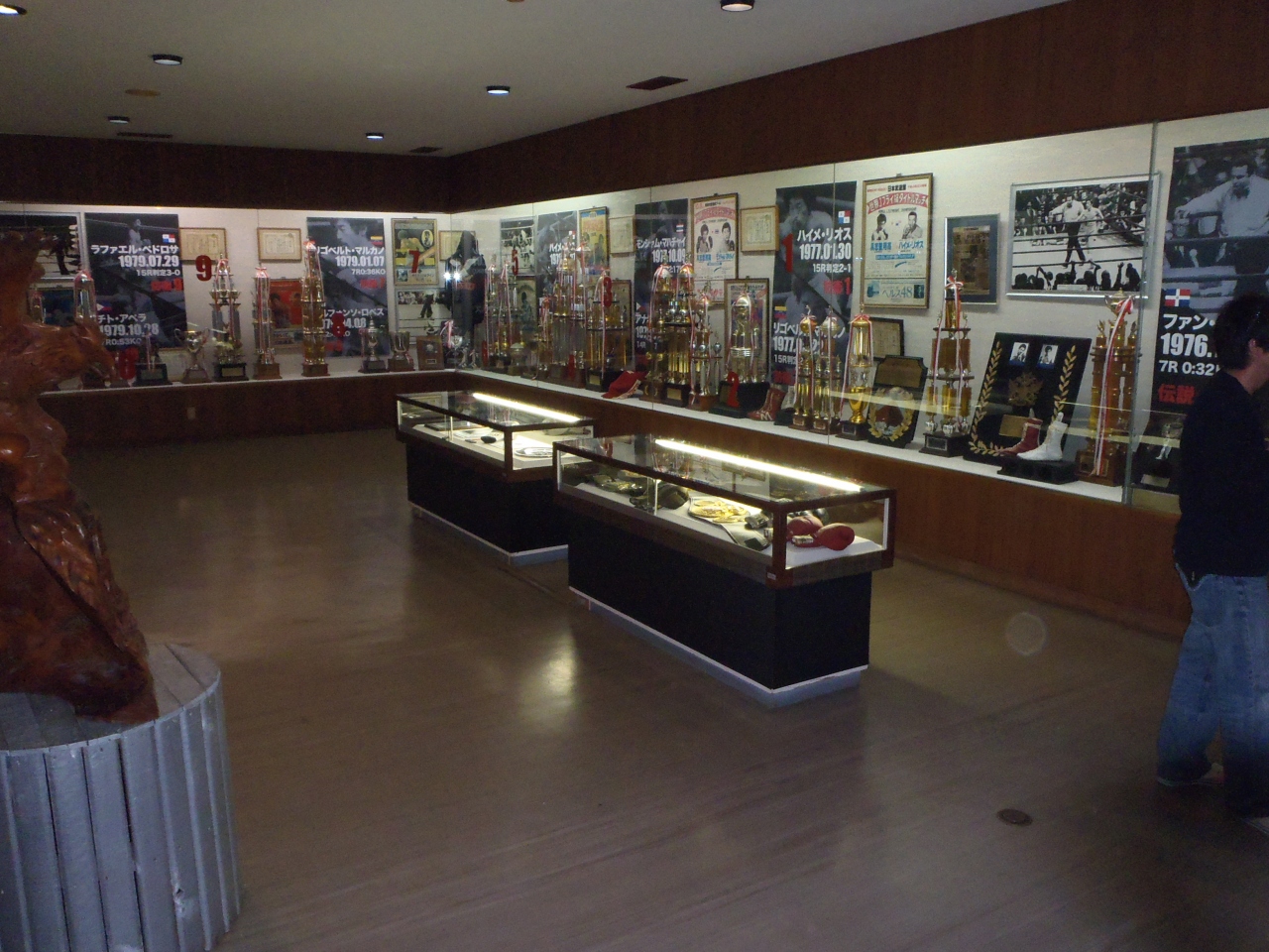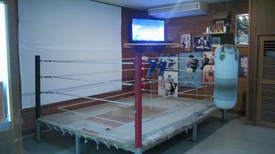 2階には特設リングやサンドバッグ現役時代の試合の映像が
