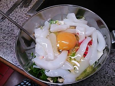 しばらくすると、生のお好み焼きのタネが出てきました。