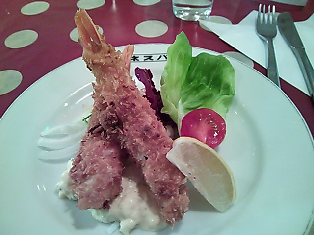 次に運ばれてきたのはエビフライ2尾に手作りタルタルソース添え、サラダ。
