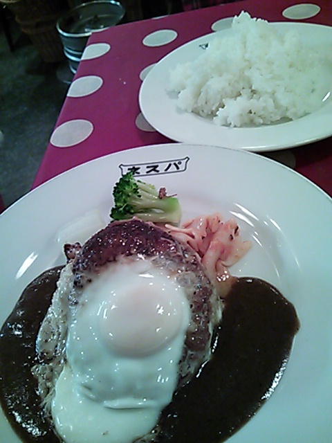 そしてメインのデミグラスソースのハンバーグ。目玉焼きが乗り、もちろん付け合わせの野菜もアリ。