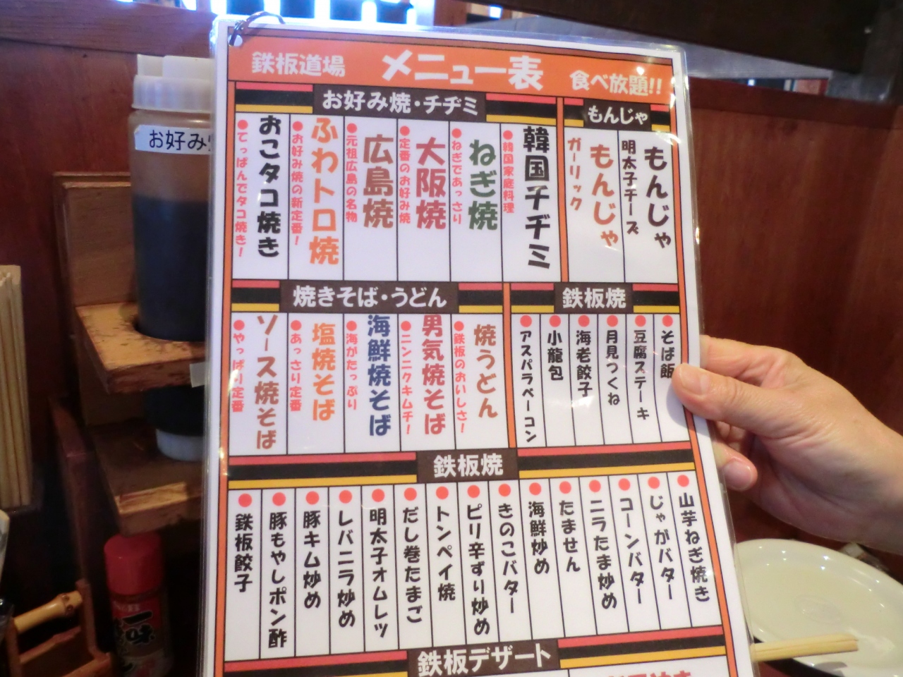 ランチに利用しました。店内は平日とあって混雑していませんでした。お好み焼き、焼きそば、アスパラベーコン、きのこ炒め(バター)など鉄板焼きが食べ放題です。お好み焼きも豚肉など選ぶことができます。店員さんが材料を席まで運んできてくれるので、大変楽です。一人前の量も多くありません。ドリンクやソフトクリームなどもありますので、かなりお得だと思います。