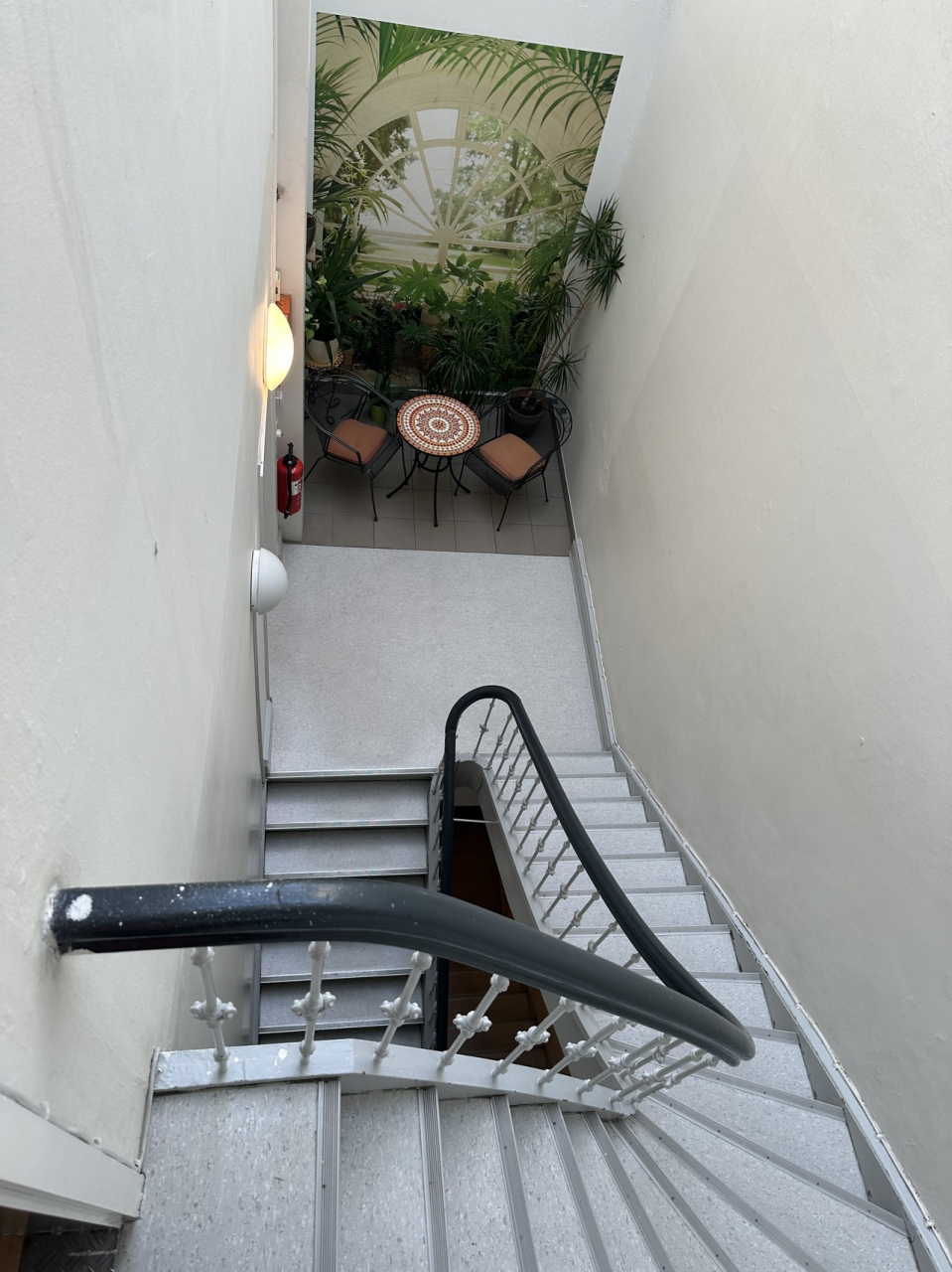 レセプションやお部屋のある2階、3階(日本式のフロアの数え方だと3階、4階)まで階段を登ります。エレベーターがないので、荷物が大きいとちょっと大変。入り口のドアを開錠する際に、予約時に登録した電話番号が必要になりますが、日本の国識別番号81...のあたまに00を入力することを忘れないようにしましょう。