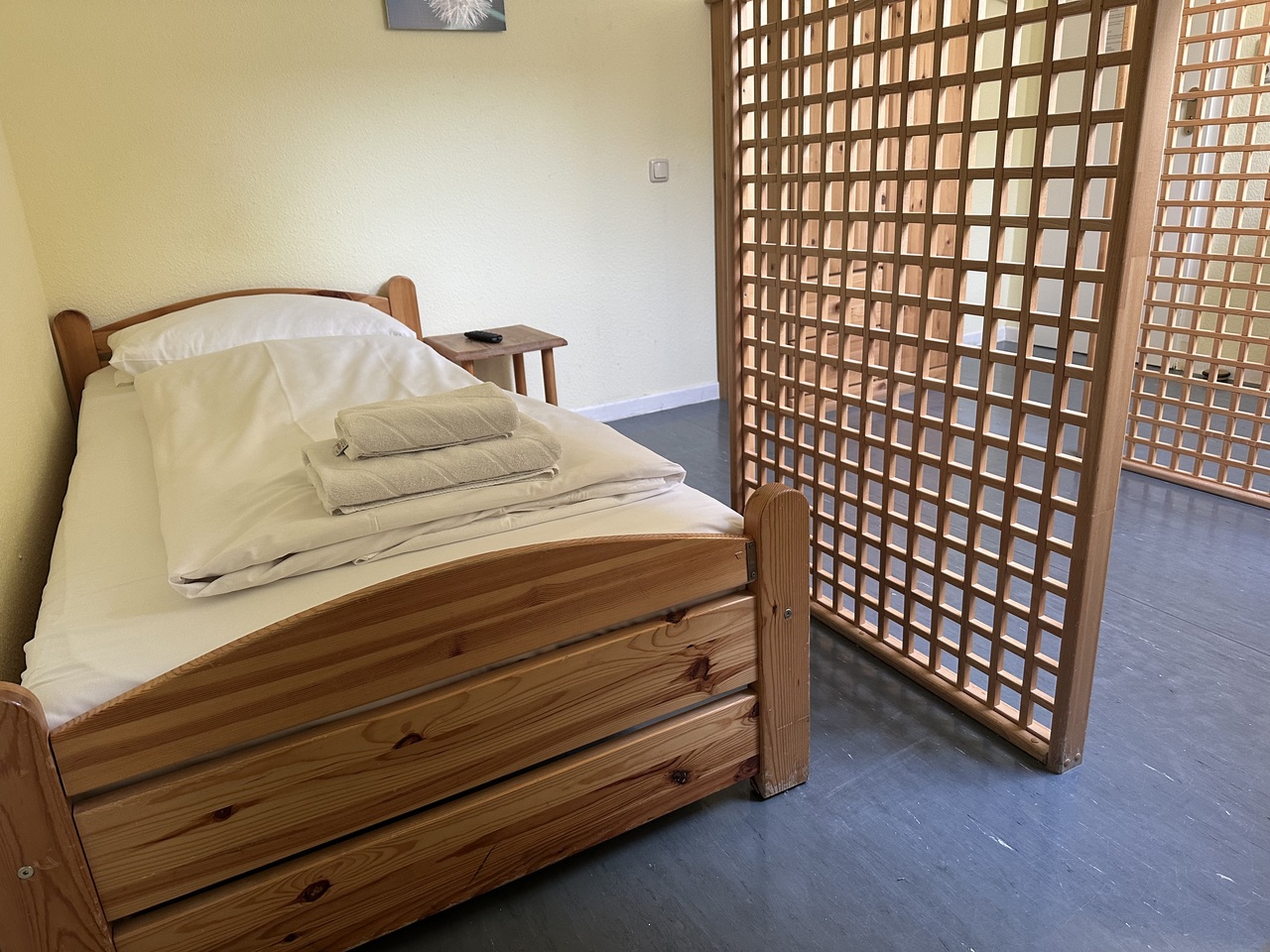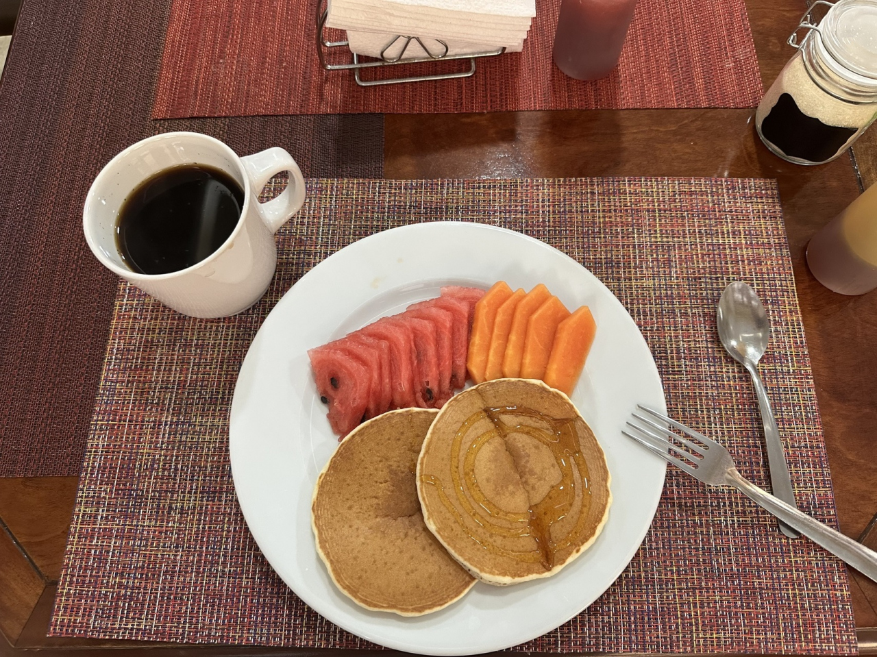 お部屋はひとり旅には十分な広さで、清潔感もあります。朝食にはコーヒーまたは紅茶にあったかいパンケーキと果物が提供されます。スタッフの方々は、皆さんとても気さくで親切でした。