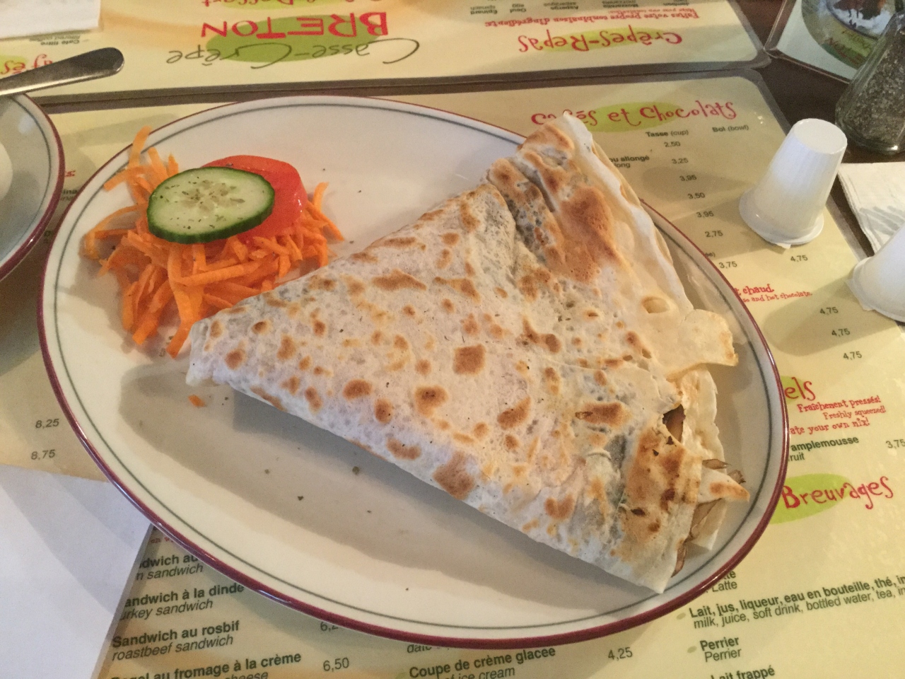 食事クレープを注文しました。具材を2つ選んで6.75ドル。ただし、スイスチーズやターキーなどは追加料金がかかります。クレープはもっちりとした食感で美味しかったのですが、具材2つというのはちょっと寂しいというのが正直な感想。周りの人が注文していたように、3つ~4つの具材入り(お薦めの組み合わせとしてメニューに記載あり)を選ぶべきだったかなと後悔しました。