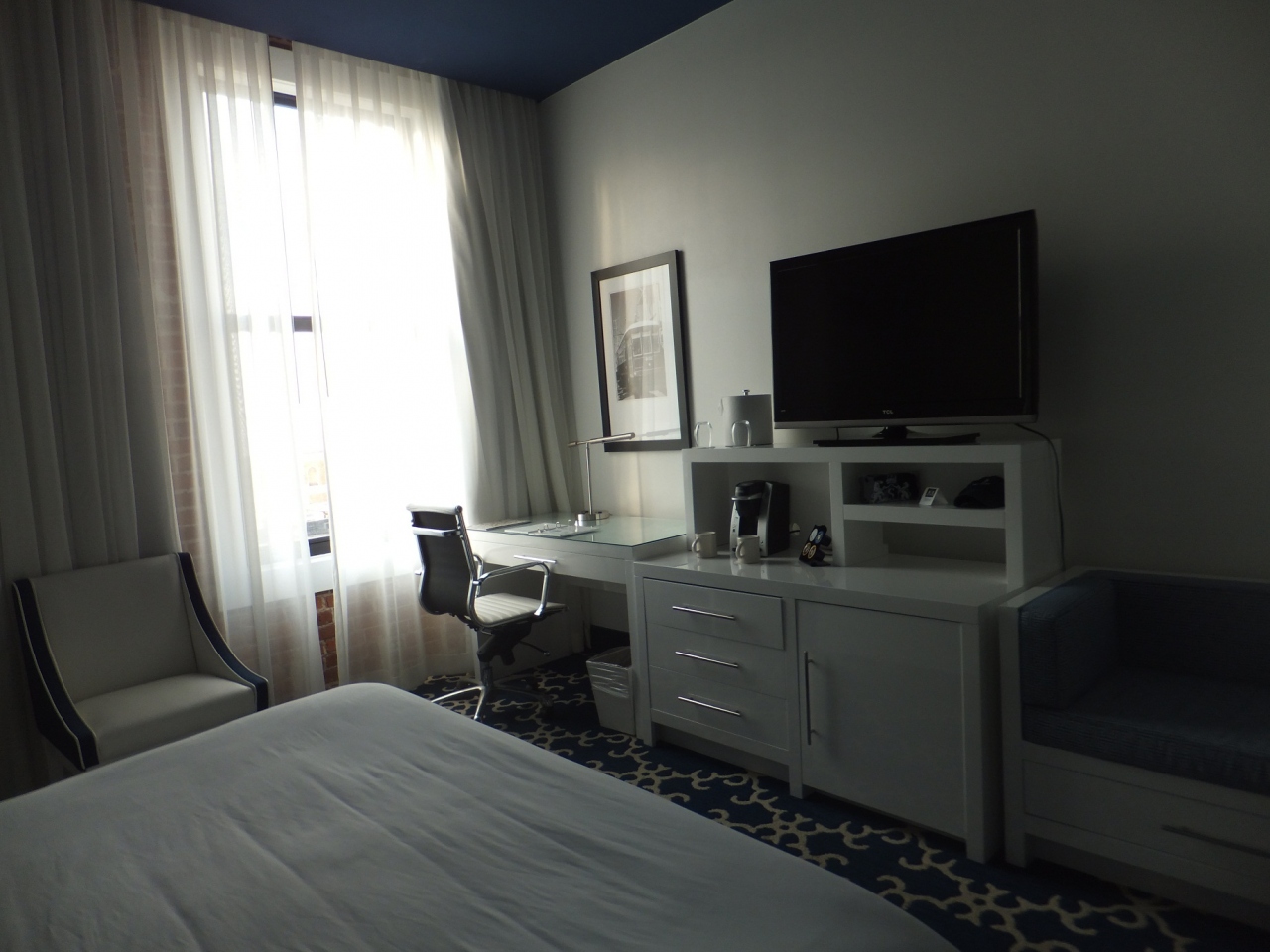 ホテルのロビーや廊下など内装は綺麗であり,客室内も白を基調とした洗練されたデザインであった。