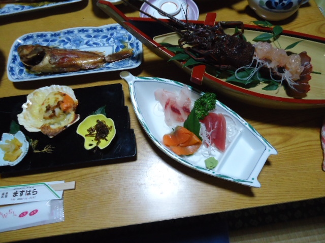 食事の量がものすごくて、お腹いっぱいを超えます。朝には昨夜の刺身でイセエビのみそ汁も出てこれも出汁が効いていてうまいですね。