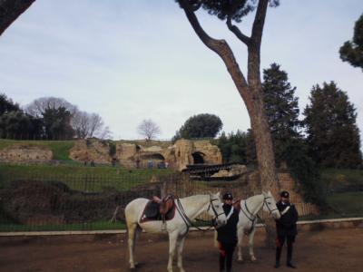 ローマ市内は多くの観光地があるのでテロなどを気にして多くの警官がそこここにいます。ここ凱旋門の近くにも、コロッセオやフォロ・ロマーノなど目白押しの観光名所があり、それらを守るために騎馬警官もいます。