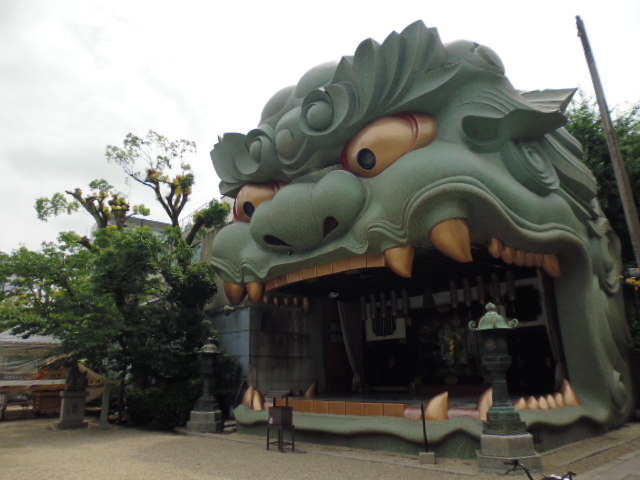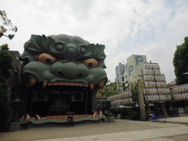 なんば駅から少し歩くと静かなエリアになり、そこに難波八坂神社があります。ここの目玉は中にある大きな鬼が口を開いているところです。