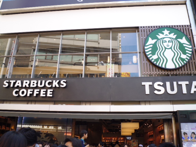 大阪ミナミの中心地角にあるのがTSUTAYAとコラボしたスターバックスコーヒー店です。ここからの眺めは戎橋方面で、多くの人が2階から眺められます。