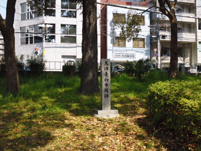 テニスコートもある毛馬桜ノ宮公園の天満橋寄りにある碑がこの天満青物市場跡の碑です。