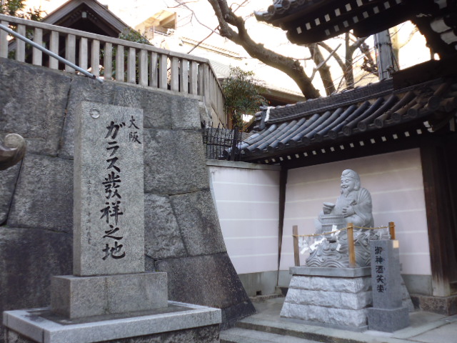 大阪天満宮の入口脇に鎮座しているのがこのガラス業発祥の地の碑です。大阪天満宮辺りは昔からガラスの製造が盛んでガラス業がこの辺りから起こったとのことです。