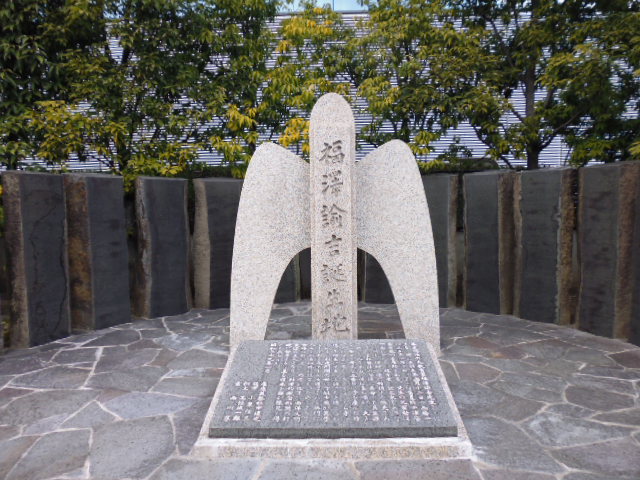 JRだと福島駅から朝日放送のビル方面に向かうと川にぶつかります。その川を左に折れると現れるのがここ福沢諭吉生誕の地の碑です。