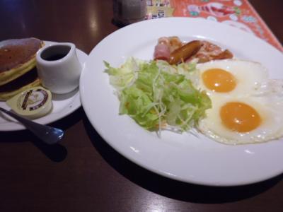 朝飯をここでいただきました。和洋いろいろなメニューがあるので迷いましたが、パンケーキをメインの目玉焼きなどの朝食です。