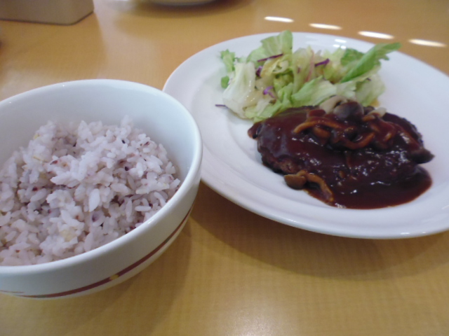 横須賀中央駅から近いビジネスホテルの2階にあるからなのか、テーブルに新聞がついていました。ランチはお得な価格でこの日はハンバーグです。