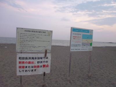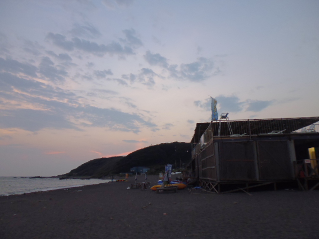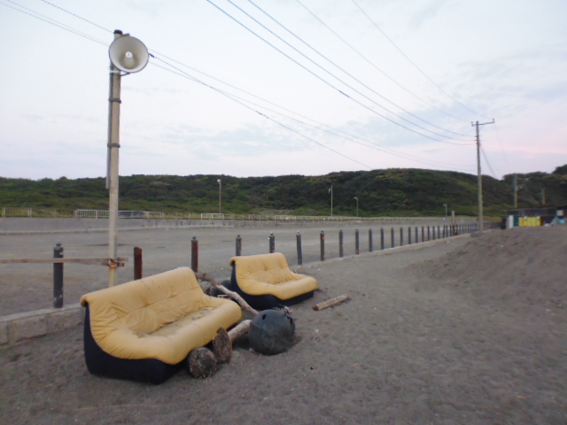 荒崎の公園から車で少し南に下るとある砂浜の海岸で、近くにはYMCAの施設があります。海岸には夏だけの海の家もあって古びたソファが渋いですね。
