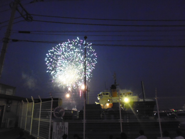 海に花火が上がり、横須賀らしい雰囲気です。今回は新ふ頭で船と一緒に写真です。- 旅行時期