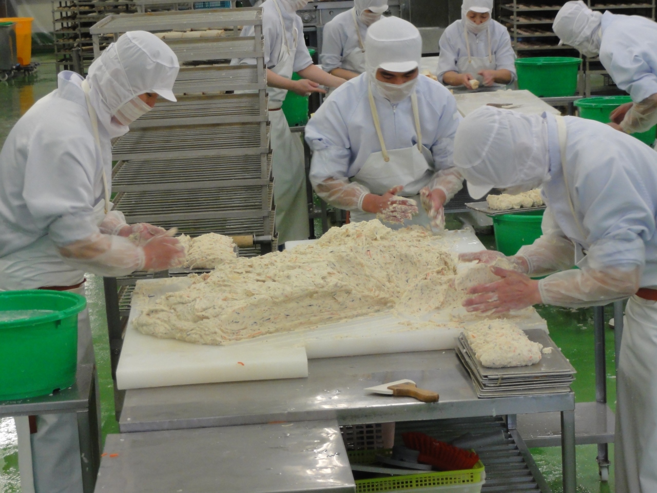 販売店舗後ろに工場があり、窓越しにさつま揚げを作っている工程が見学できます