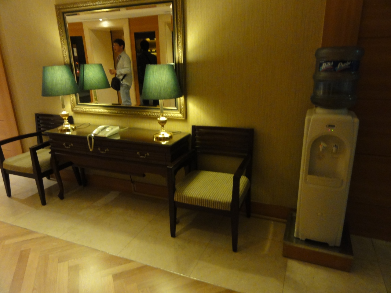 部屋にペットボトルのミネラルのサービス無し。エレベーターホールにあるウォーターサーバーまで自分で水を汲みに行くスタイル。