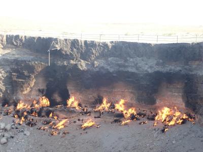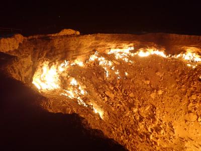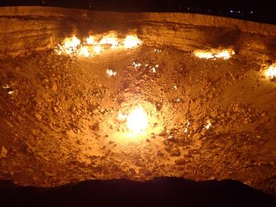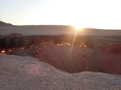 ウズベキスタンのウルゲンチを朝に出発し、トルクメニスタン国境を越えた後、ツアーでチャーターした4WDで行きました。現地に着いたのは午後7時半ごろ。とにかくめちゃくちゃ遠いです。しかも、途中はデコボコ道の悪路。ただ、そこまでして見に行く価値はあると思います。直径60メートルのクレーター内部で激しく火が燃え盛っています。写真を見るとあんまり燃えていないように見えますが、近づくと熱風が吹き上げてきて驚きます。これ以上燃えていたら危険です。絶妙なバランスで燃え続けています。微妙なにおいのガスが出ていて、あんまり吸い続けると体に良くないと思われます。現場近くでは、新たなガス田を掘る準備が始まっていました。そちらでガスを抜いてしまえば?地獄の門の火は消えるようです。まあ、無駄に燃やしていてももったいないし、有毒ガスを排出し続けているのも問題と思うのでやむを得ません。早ければ来年にも止まる(遅くとも数年後)ようなので、気になる方は早めに見に行くことをお勧めします。
