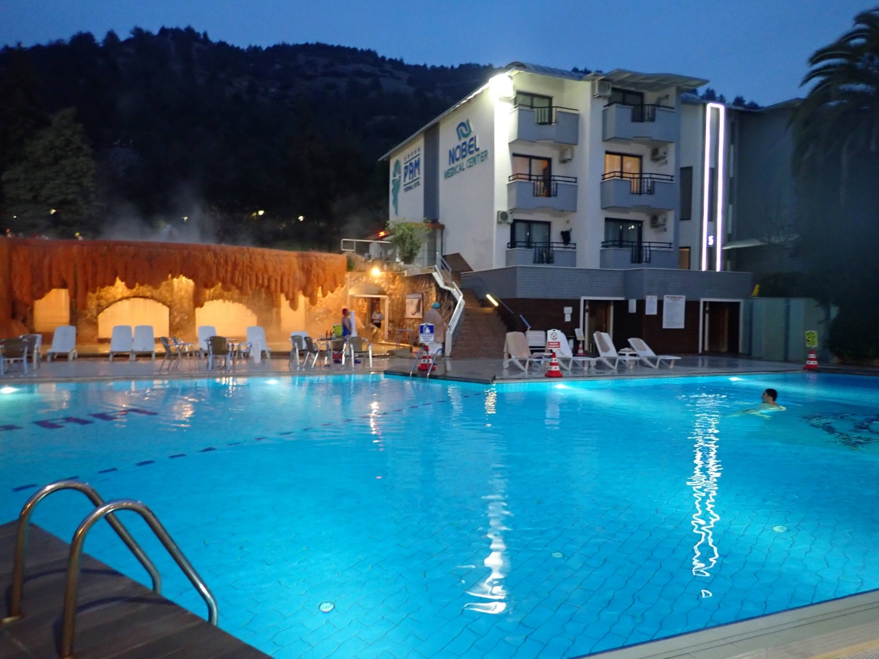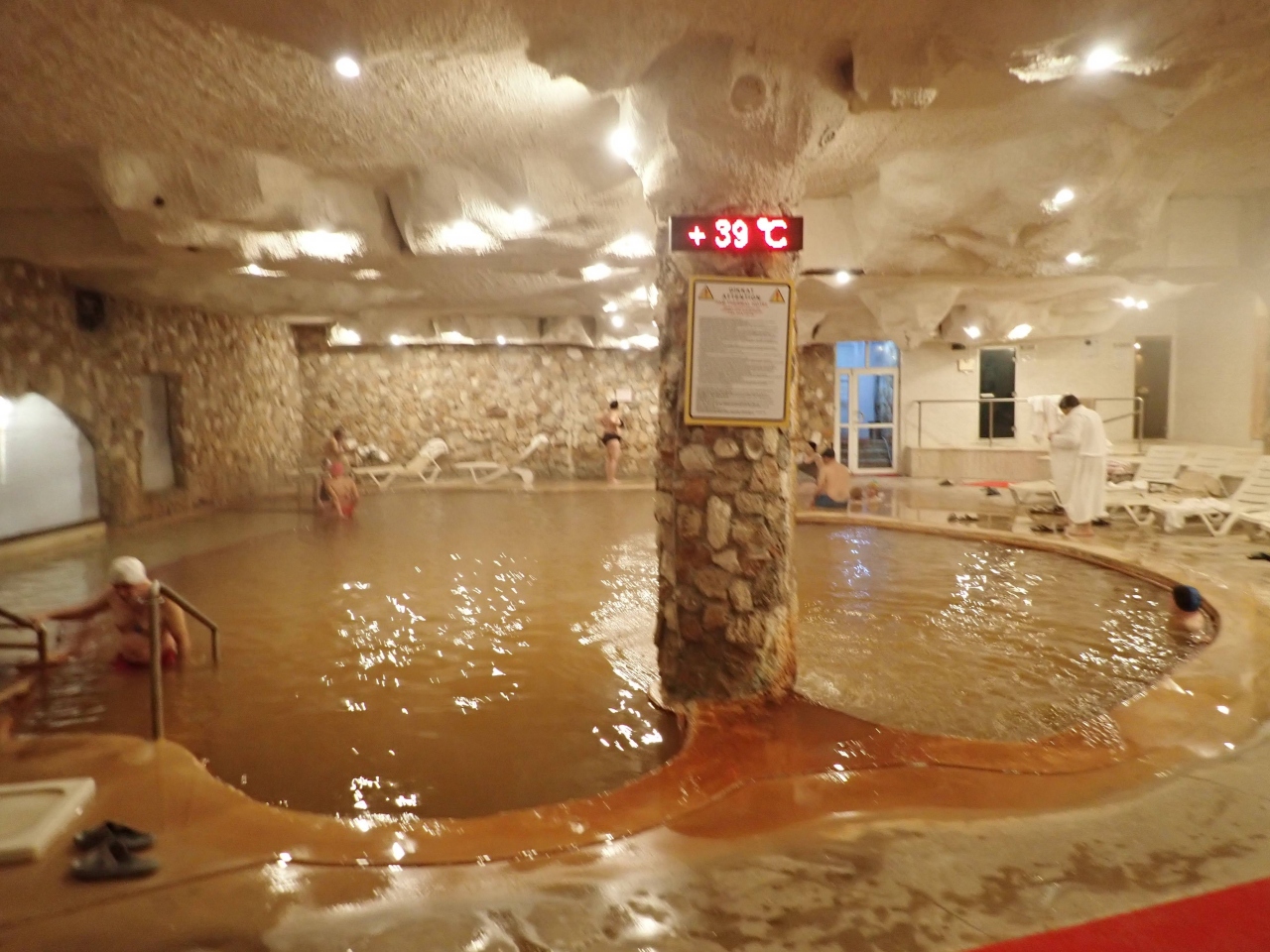 ツアー利用で正確な費用は不明。温泉プールが名物です。屋内と屋外にパムッカレの石灰棚風の湯舟があります。一見、いっぱい入るところがあるようで、実はあったかいのは一番上の源泉?が出ているプールだけです(^_^;)日本人は屋外の一番上か、屋内のジャグジーのところを使っていました。他はちょっとぬるく感じるでしょう。水着と水泳帽が必要です。持ってこなくてもプールで買えますが。部屋にも温泉が出る金色の蛇口がありました。使わなかったのでどの程度のものかは不明。食事は悪くなかったです。メニューはまあまあ豊富。部屋のテレビが一見ガラスのようで映像が映るというオシャレな作りでした。