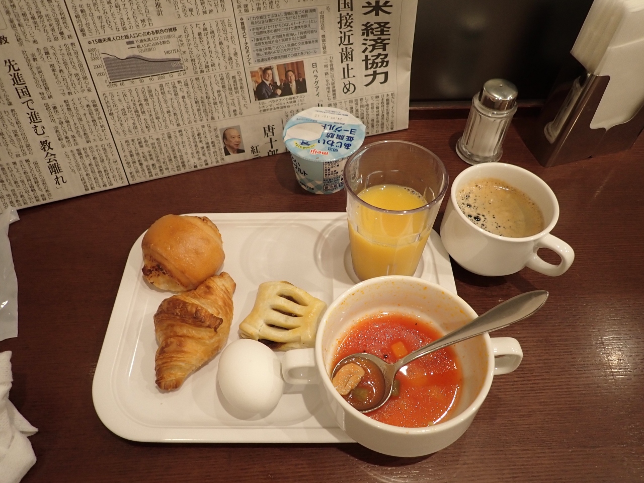 無料朝食付きですが、小さめのトレイにパンとスープ、ヨーグルトぐらいでちょっとさびしい。とはいえ、朝から大量にバイキングで食べるホテルが好きでない人もいるような気もするので、これはこれで悪くないかと。大浴場は快適。リラックスルームにマンガもあり、マッサージチェアや岩盤浴もあるなど、施設はまあまあ充実。単に寝るだけ以外の過ごし方ができるのは悪くないです。ゴールデンウイークに利用したとはいえ、シングル13800円はちょっと高いかなあ。