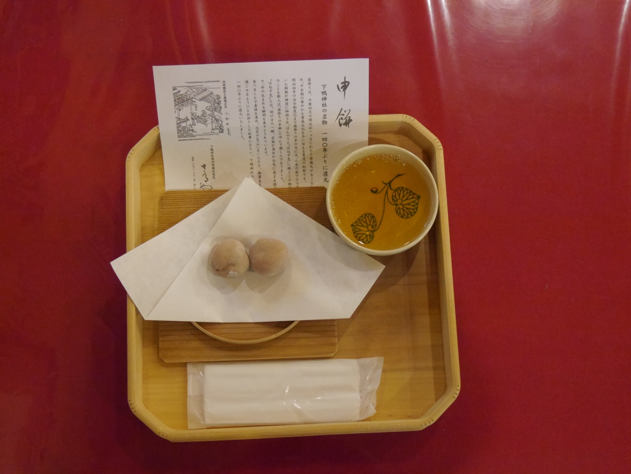 昔、葵祭りの例祭の期間中の申の日に無病息災を祈って食べたという「さるや」の申餅。明治以来、途絶えていたものを2010年に下鴨神社の宮司の口伝を元に茶寮宝仙が復元したもので、程よいやわらかさと小豆の粒を残した上品な甘さです。