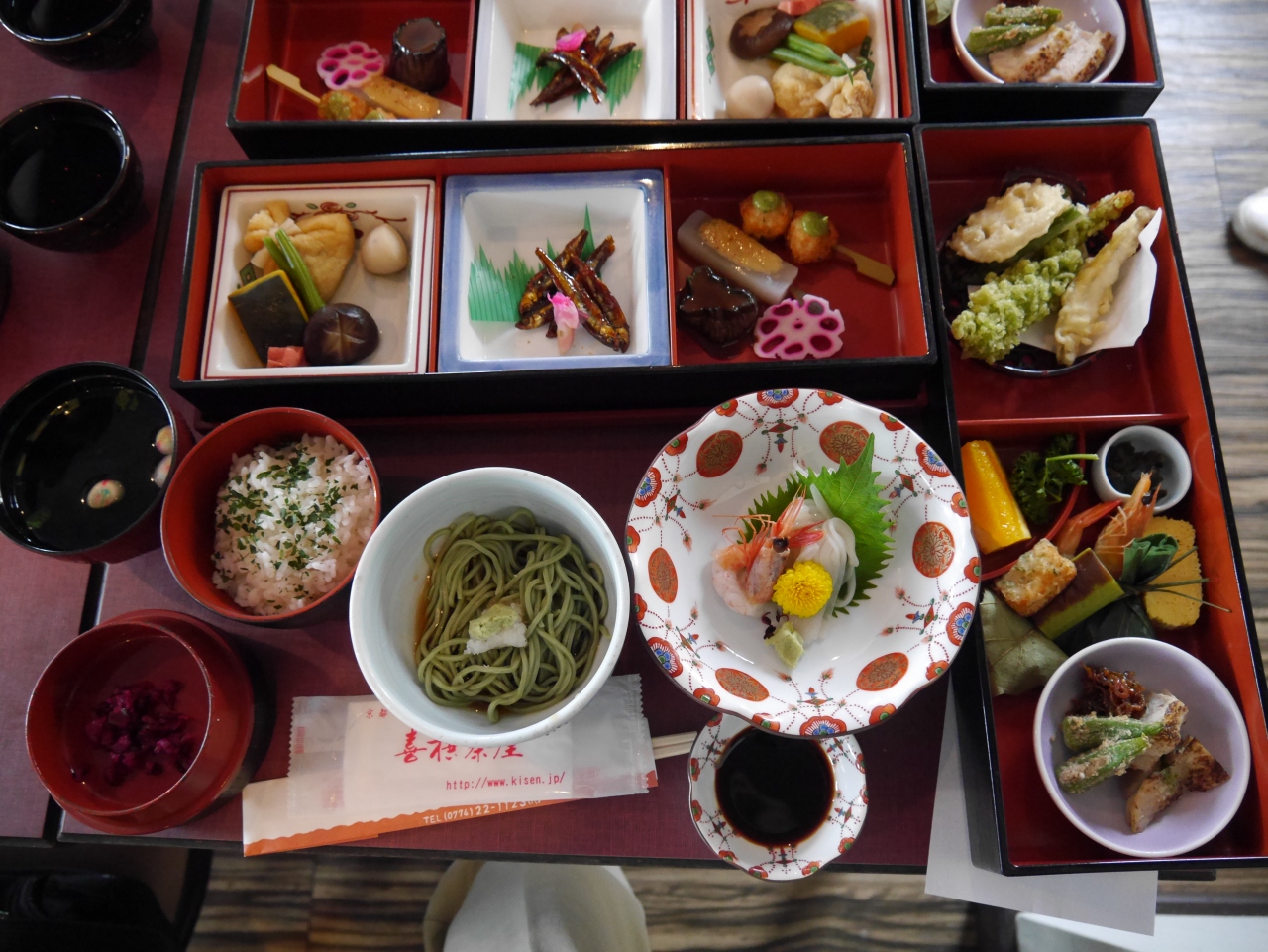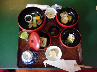 大寺院の大徳寺内にあるだけあった、落ち着いた静かな環境です。玄関にいたる路地も風情ある造りになっていて趣があります。料理は鉄鉢(てっぱち)料理というので鉄の器で出てくるのかと思っていたら、昔僧侶が托鉢に使っていた鉄の鉢に似せて作った器を使ったものでした。大きさの違う鉢形の器5つに精進料理が盛られていて、食べ終わるとうまく重なるようになっています。料理はおいしかったのですが、最初に出される抹茶は、お客さんが多かったせいかダマになっていましたし、味も抹茶本来の甘さではありませんでした。
