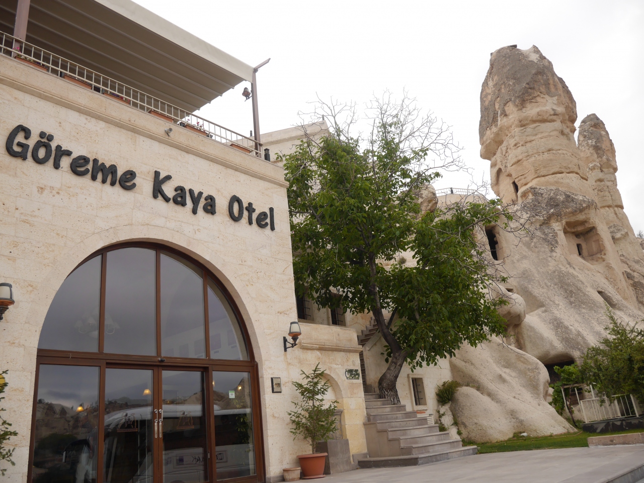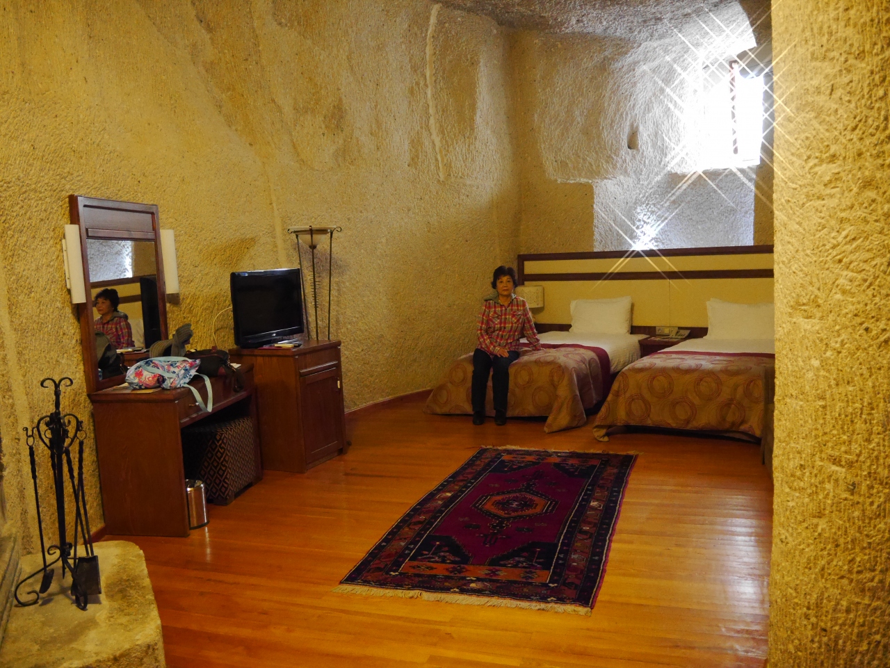 一度は泊まってみたい洞窟ホテルでした。カッパドキアのきのこの形の岩をそのまま利用して部屋にしており、壁、天井は洞窟の壁そのままです。明かりとり用に小さい窓がついていました。洞窟によって部屋の形はさまざまなようです。私たちが泊まった部屋は、奥行が深く入り口から右に曲がっていくように部屋が作られています。ワンルームで広さは十分で、入り口から一番奥まで20m位でしょうか?唯一の難点はバスルームでした。洞窟の天井が高いため、バスルームの扉の上がずっと空いていて入浴中は温まれませんでした。しかも、シャワーカーテンがなかったため、床が水浸しになってしまいました。