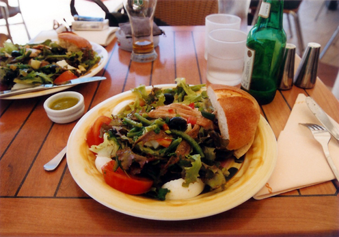 ニューカレドニアのシトロン湾ショッピングセンターにある、サラダカフェ「サラディシモ」。このお店には、日本では食べられないような、いろいろな種類のサラダがあります。また、日本でいう「サラダ」とはちょっと違った感覚で、パンがついていたり、マグロのグリルがのっていたりと、メインとしても十分いけます。そのうえ、一人では食べきれないくらいのボリュームなのです。味はもちろん言うことありません。写真は「ニース風サラダ」1/2人前(半分に分けて出してくれます)。サラダは1人前1200CFP、ビールは1本500CFP(当時、1CFP=1円ちょっとでした)。